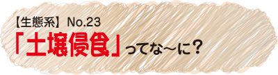 土壌侵食によって土壌の機能が損なわれると、食物生産量の落ち込み、水質悪化、生態系の破壊、土地の砂漠化等につながります。また、表土が流出することで植物が育たなくなった土地では、光合成の効果も減少し大気中のCO2が増加していきます。 ヒマラヤ、アフリカなどの山岳地帯、インド、中国などの半乾燥地帯では過放牧、過度の森林伐採、不適正な農業、大規模開発等が原因となって、降雨などによる土壌侵食が深刻化しているそうです。